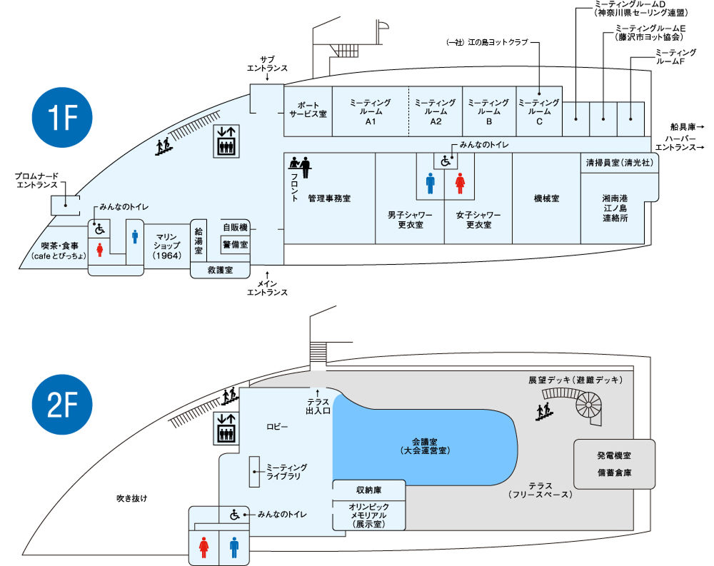 さまざまな手続きや各施設についてのご案内などの窓口業務を行うフロントや、海が見える会議室などを備えた江の島ヨットハーバーの管理を行うヨットハウスです。