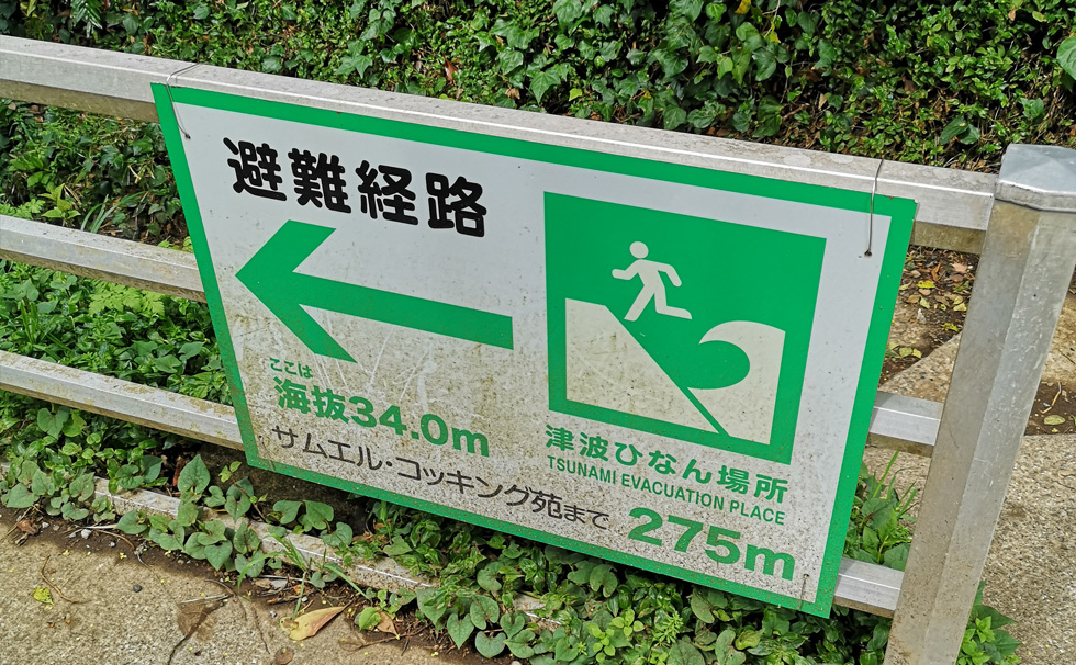 江の島の頂上に向かう通路は階段が多く、民家の愛度を通り抜ける通路のため、とても狭い道や急な階段もあります。また落石や足元が滑りやすい可能性もありますので、注意をしながら避難をしてください。避難経路途中には誘導看板(緑色)が設置されています。
