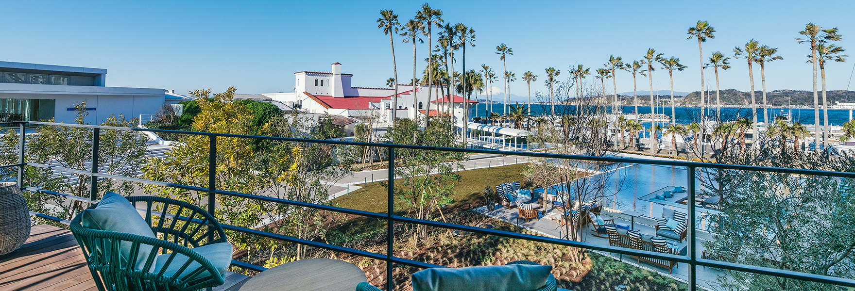 バルコニーに出ると、眼下のウォーターガーデンから始まり、ヨットハーバーやヤシの並木、