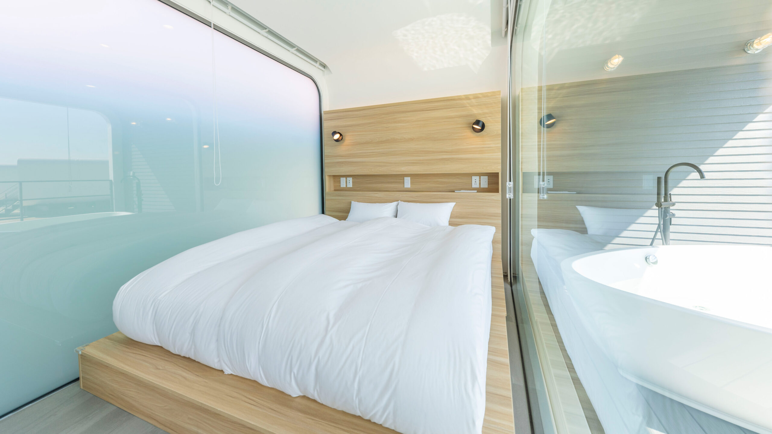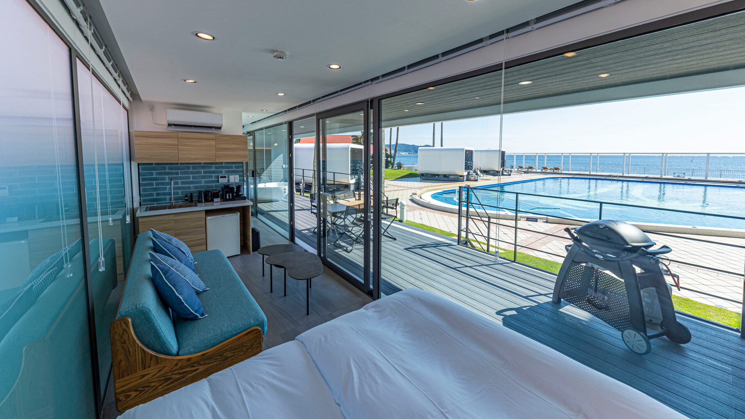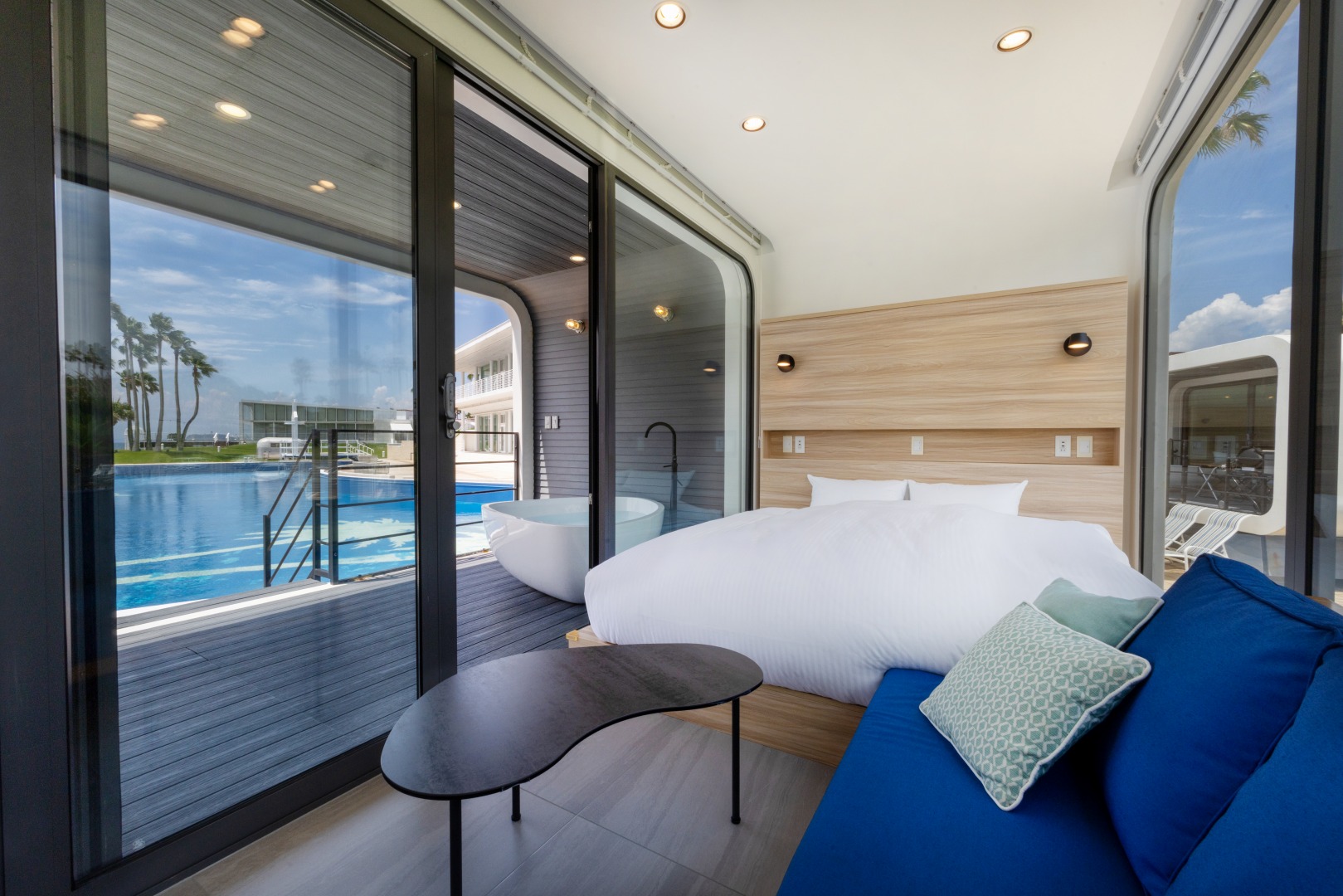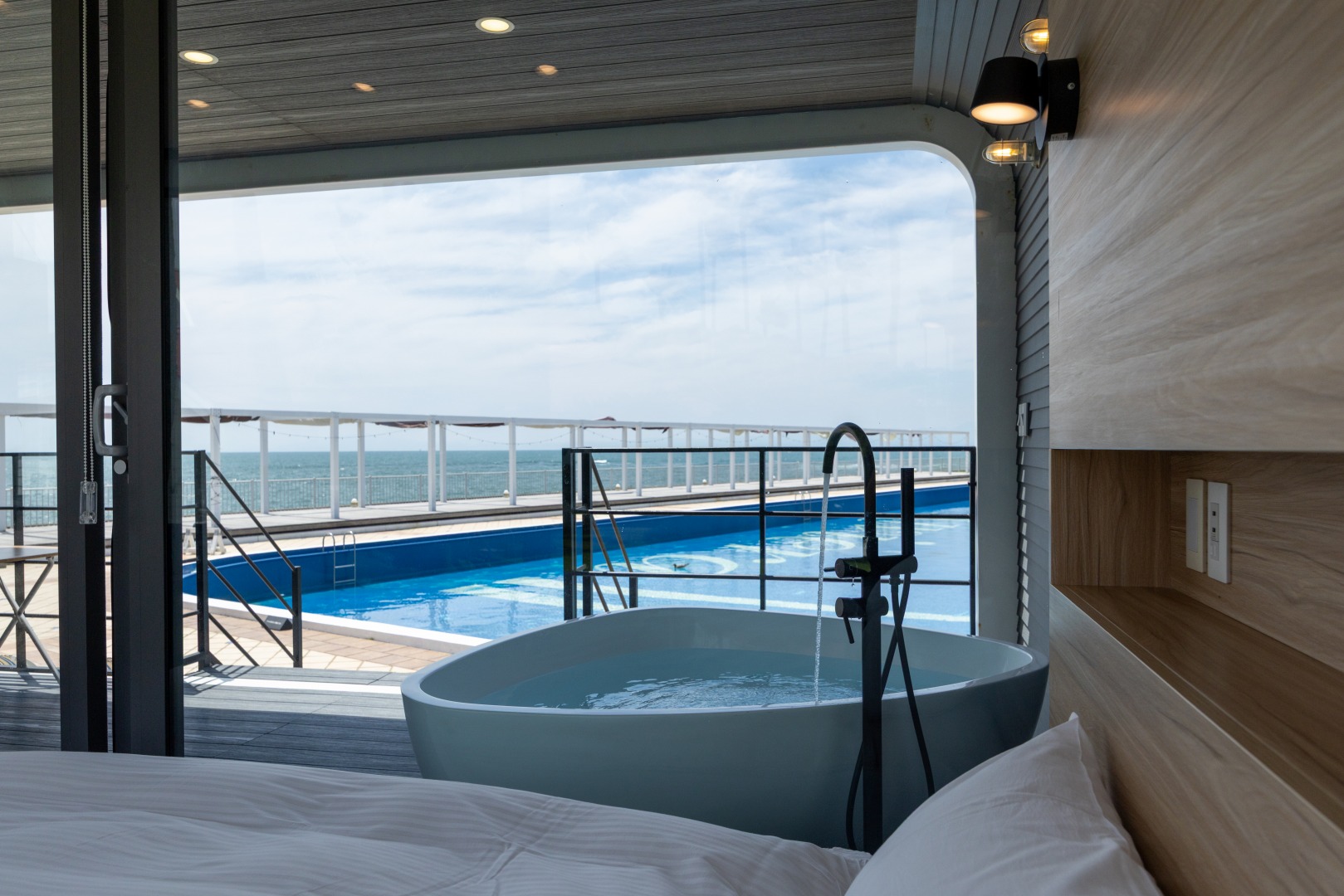 開放感ある一面のガラスに、そよぐ潮風を楽しむ広いテラスを有する客室は、オーシャンビューの好立地を存分に楽しむための日本初の新たなデザイン。