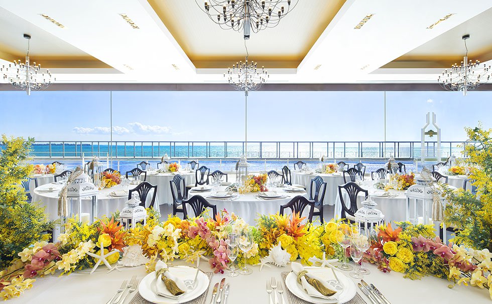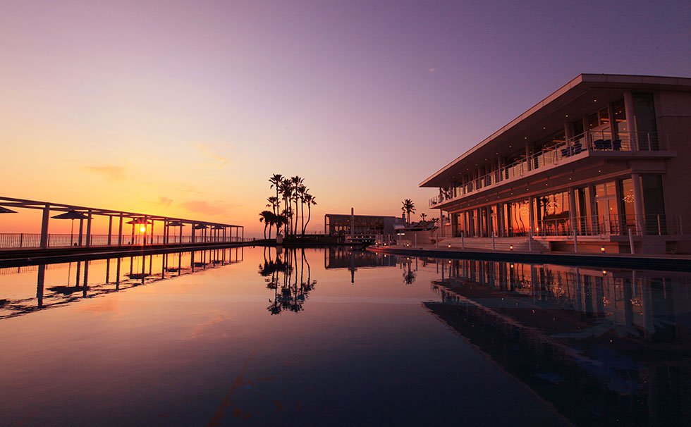 輝く海を270度も見渡せる、絶景の独立型チャペル。ガラスと白木で造られた明るい空間に、眩しいほどの自然光が降りそそぎます。マリーナ内でも最も海にせり出している一角にあるため、まるで人物が海に浮かんでいるようなシーンを演出することができます。すべてが黄金色の夕陽に染まるサンセットタイムは息をのむ美しさ。