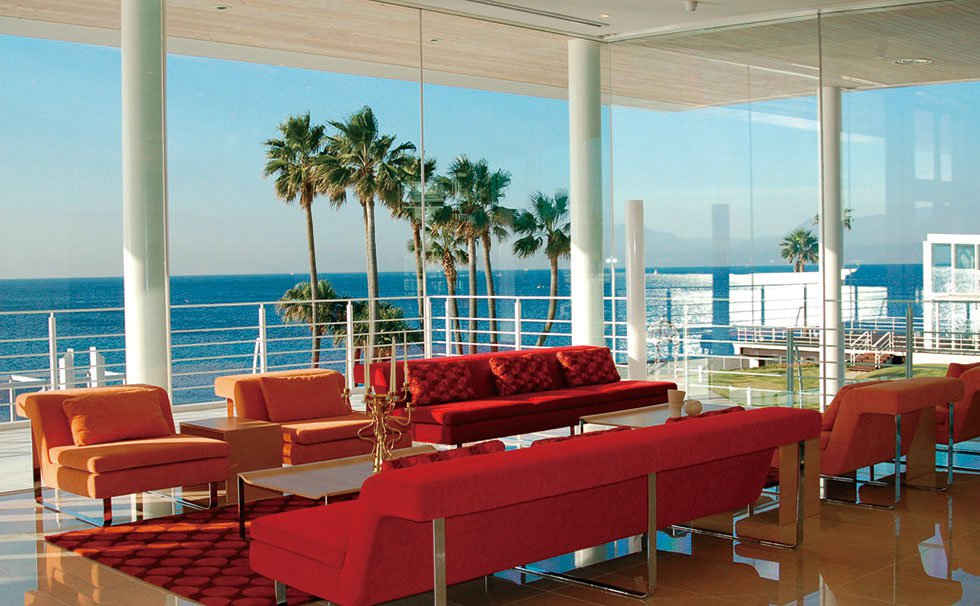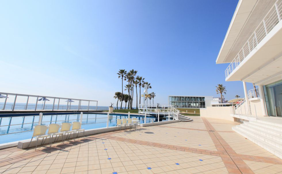 海に面した広大なプールサイドを背景にひときわ白く輝くモダンなゲストハウス