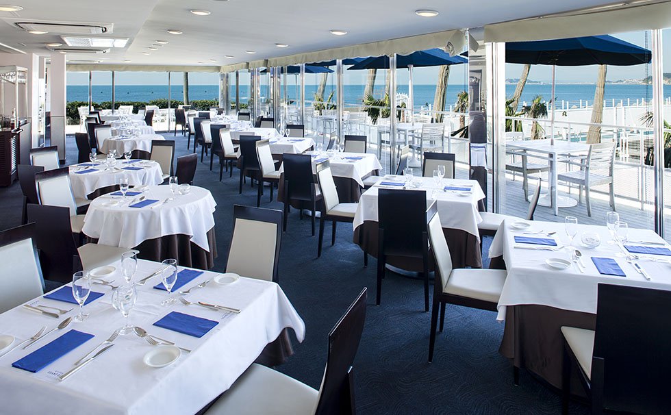 桟橋のようなアプローチが印象的なレストラン。レストラン内には、ゆったりとくつろげるソファが配されたロビーにドーム型天井や木製カウンターがシックなバーも開設されています。コバルトの水平線やロマンティックなサンセットが望める特等席は、大人の時間を演出するのにびったりの空間です。