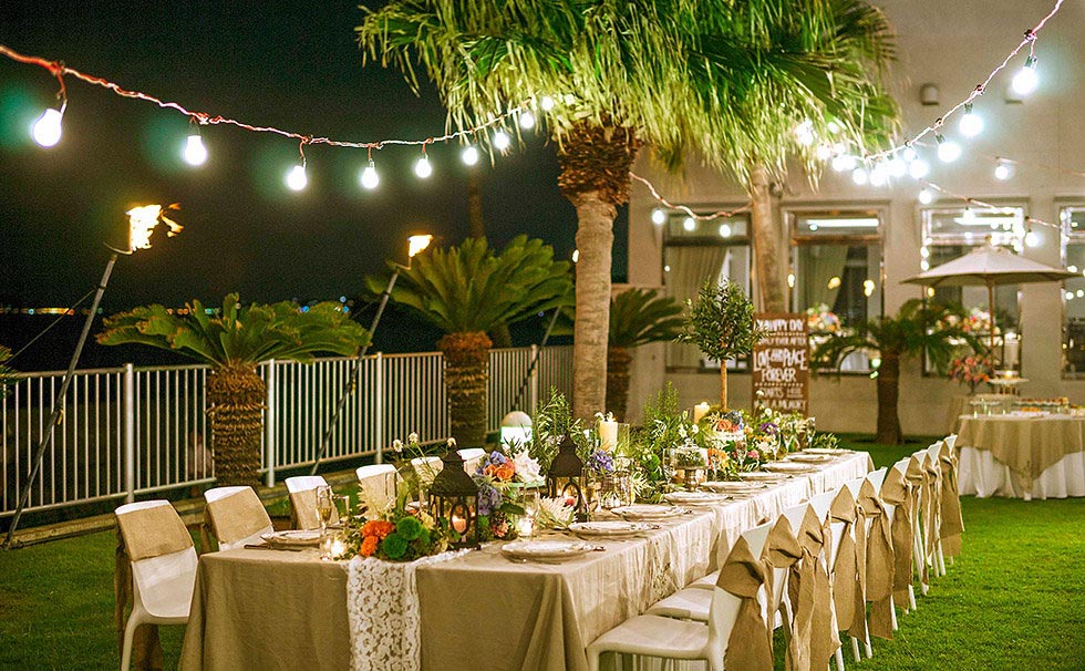 レストランの隣の海に臨んだパーティ会場「アクアガーデン」。会場から続く緑豊かなプライベートガーデンでは、燦々と降り注ぐ太陽と潮風に包まれたガーデンパーティも素敵に映えます。煙めく朝日やオレンジ色のサンセットに染まりゆく海の表情までも楽しめる、三方を海に囲まれた賛沢な撮影スポットです。