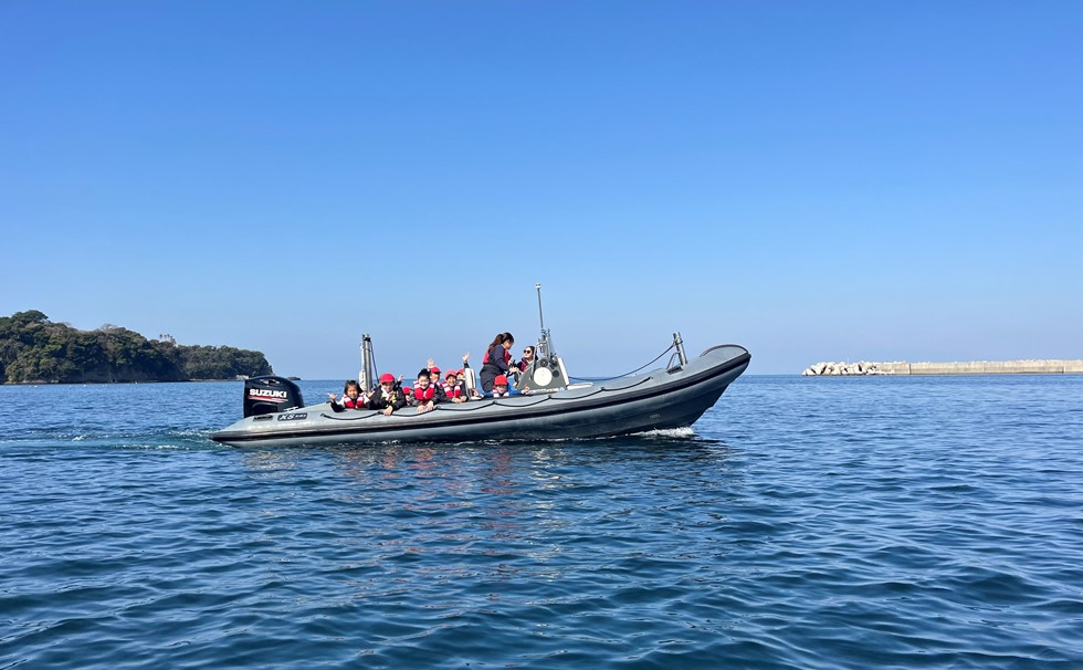 穏やかな小網代湾をボートに乗りクルージング。小網代の森や地形を海から見て、環境を学びます。