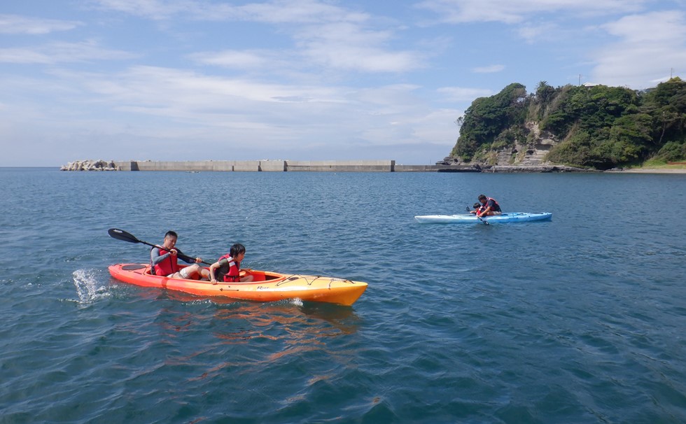小学生でも安心して乗れるシーカヤックを使用。2名ペアで息を合わせてパドルを動かしカヤックを進めます。