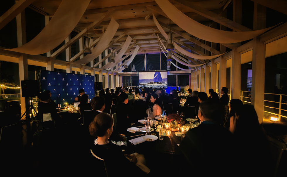 マリーナから続くブルーカーペットを進むと、海のサンセットを望むプールサイドへ。ブラックタイやイブニングドレスを身に纏った参加者の皆さまは、海を臨むこの特別な空間で語らい、未来への希望を分かち合いました。